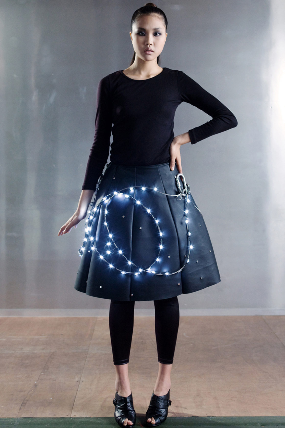 The skirt shows this excitement visually as it is responsive to heartbeats. The lights on the skirt reveal how the pulse changes by regaining easiness through swinging back and forth in the skirt. The Swing Skirt can be used anywhere where it can be hung.
